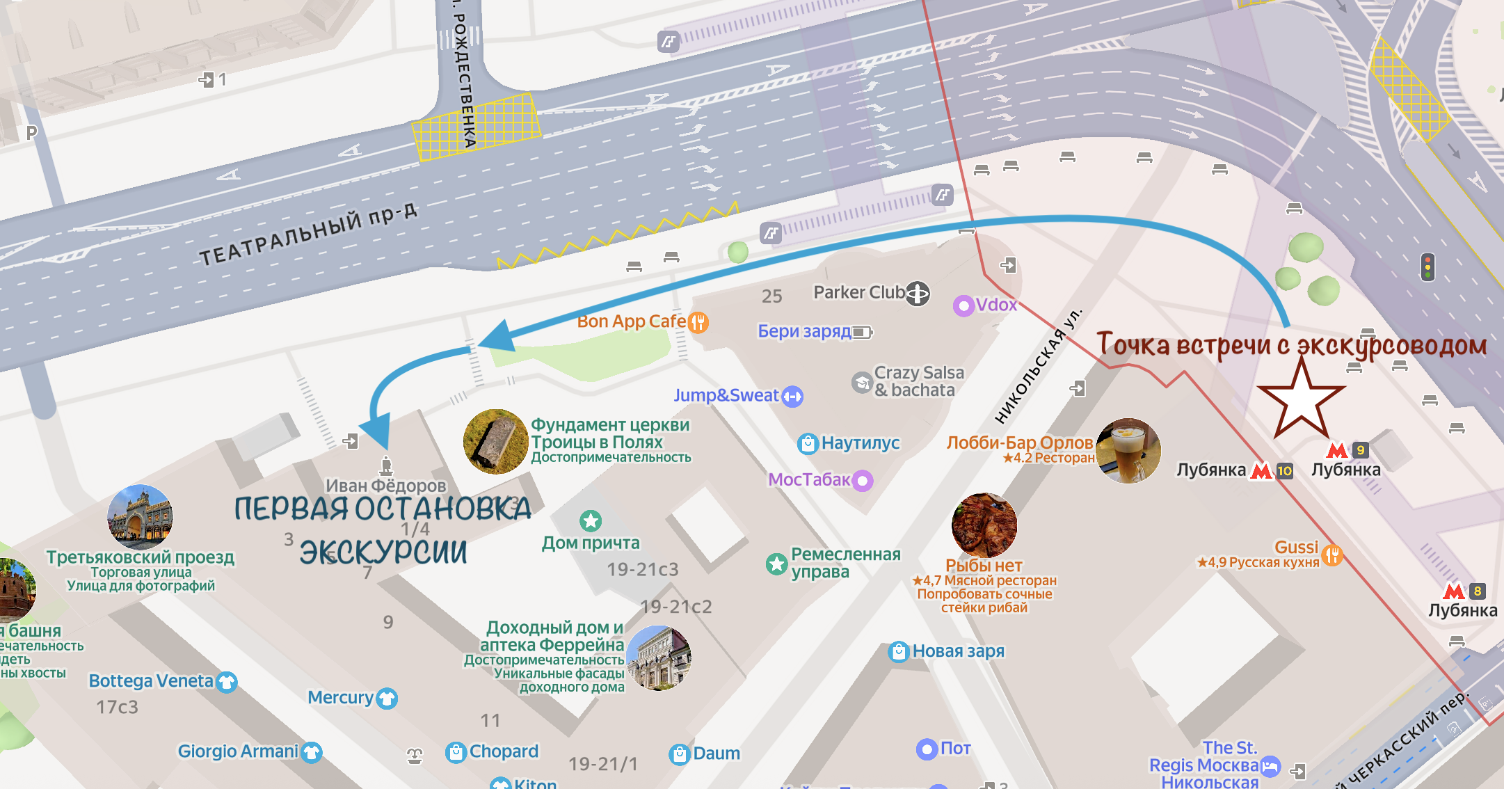 Станция метрополитена «Лубянка» (Выход №9) встреча с экскурсоводом – памятник Первопечатнику Ивану Фёдорову на Театральном проезде – Третьяковский проезд – Никольская улица – Богоявленский переулок и Богоявленский храм – Никольская улица – Красная площадь / Государственный исторический музей – Кремлёвский проезд – Моховая улица – здание факультета Журналистики & Татьянинский храм МГУ (завершение экскурсии – ул. Моховая 9с1).