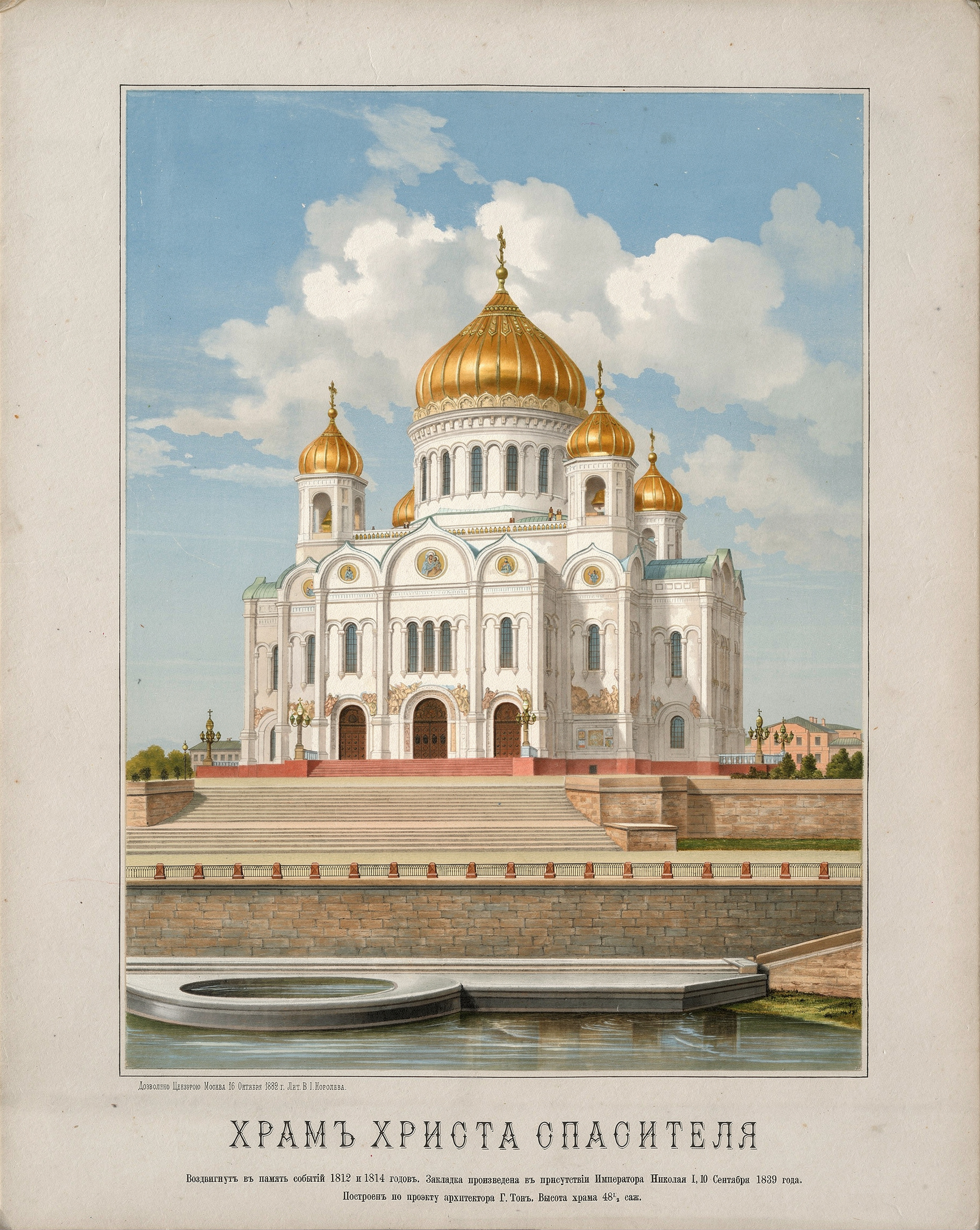 История появления Храма интересна сама по себе и была связана с оригинальными конкурсными проектами Джакомо Кваренги, Андрея Воронихина, Авраама Мельникова и Александра Кутепова. Но после всех перипетий со строительства первого храма на Воробьёвых горах архитектором Александром Витбергом император Николай Первый утверждает проект Константина Тона и новое место строительства Храма Христа Спасителя недалеко от кремлёвских стен.