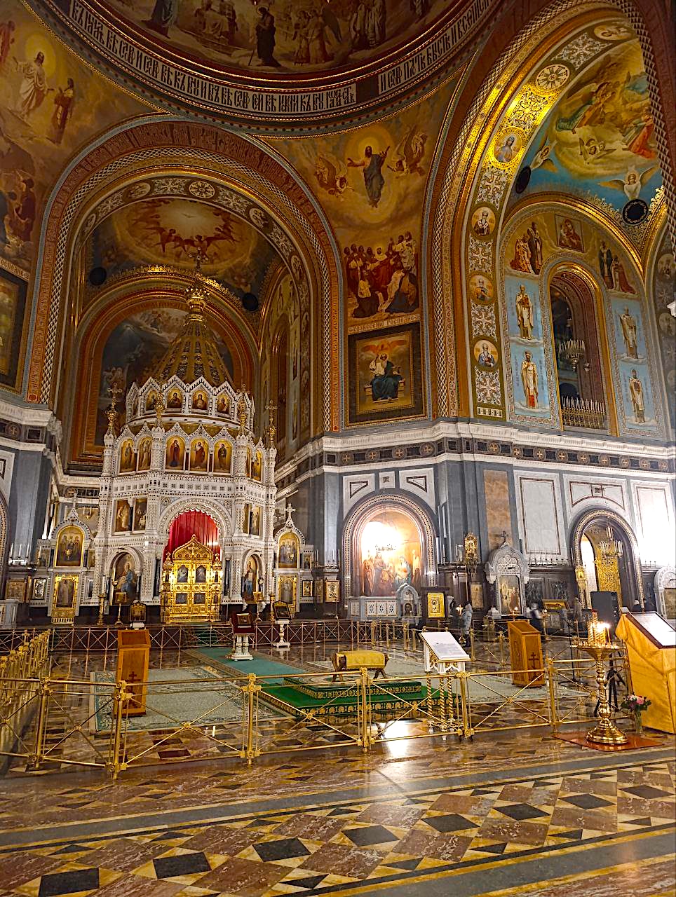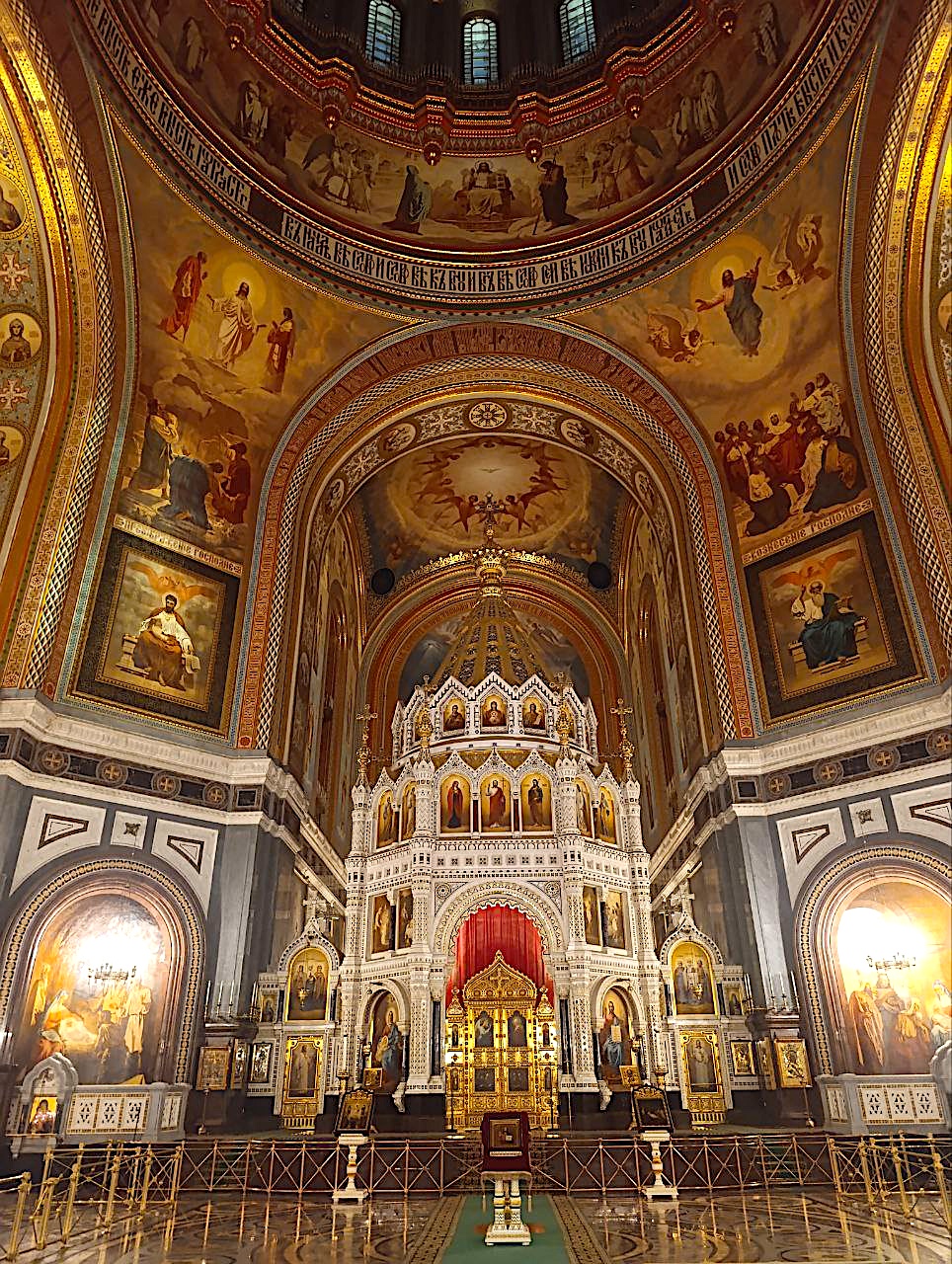 Северный вход в Храм Христа Спасителя / ХХС (со стороны улицы Волхонки) от зоны досмотра вещей – Обходная галерея – панорама Кувуклии (иконостаса) – икона «Собор Новомучеников и Исповедников Российских» - рака с мощами Святителя Филарета Московского – икона «Спас Нерукотворный» (работа Е. С. Сорокина) – Царские троны – икона Священномученика отца Александра (Хотовицкого) – Возвращённые иконы ХХС: «Владимирская», «Смоленская-Устюжная» - Западный портал ХХС – Преображенская церковь – Музейная галерея и Церковные лавки (завершение экскурсии). Ближайшая станция метрополитена – «Кропоткинская». // После окончания экскурсии можно самостоятельно посетить панорамную площадку ХХС за дополнительную плату //.