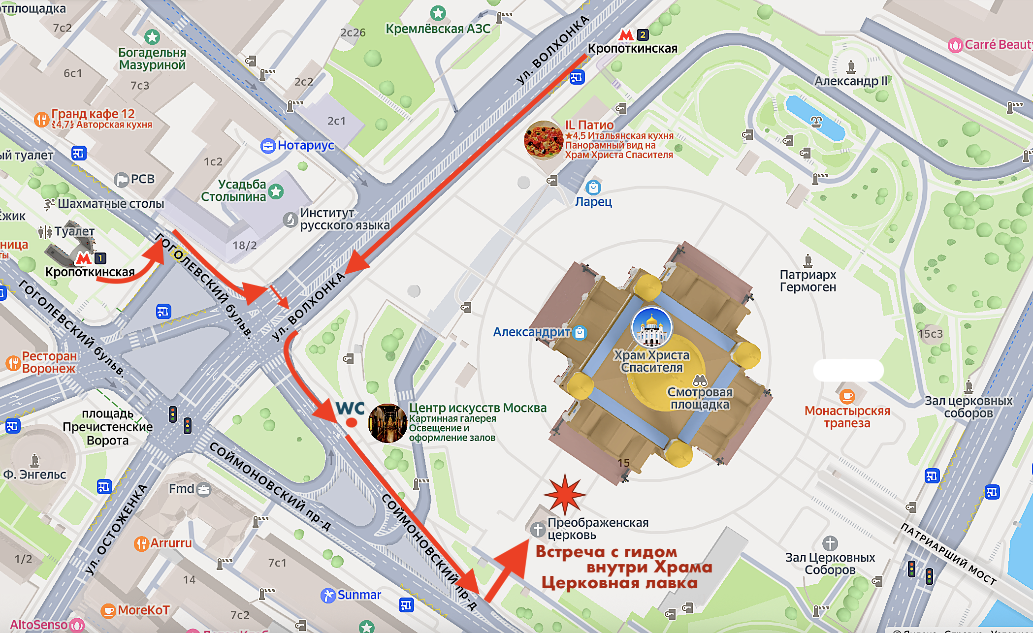 Метро "Кропоткинская" (Выходы №1 или №2 - смотрите схему по встрече с гидом в Галерее) – Западный вход в Храм Христа Спасителя (Преображенская церковь) / ХХС (со стороны Соймоновского проезда) от зоны досмотра вещей – Церковная лавка (место встречи с гидом) - Музей Храма Христа Спасителя - Преображенская церковь - Обходная галерея – панорама Кувуклии (иконостаса) – икона «Собор Новомучеников и Исповедников Российских» - рака с мощами Святителя Филарета Московского – икона «Спас Нерукотворный» (работа Е. С. Сорокина) – Царские троны – икона Священномученика отца Александра (Хотовицкого) – Возвращённые иконы ХХС: «Владимирская», «Смоленская-Устюжная» - Северный портал ХХС.